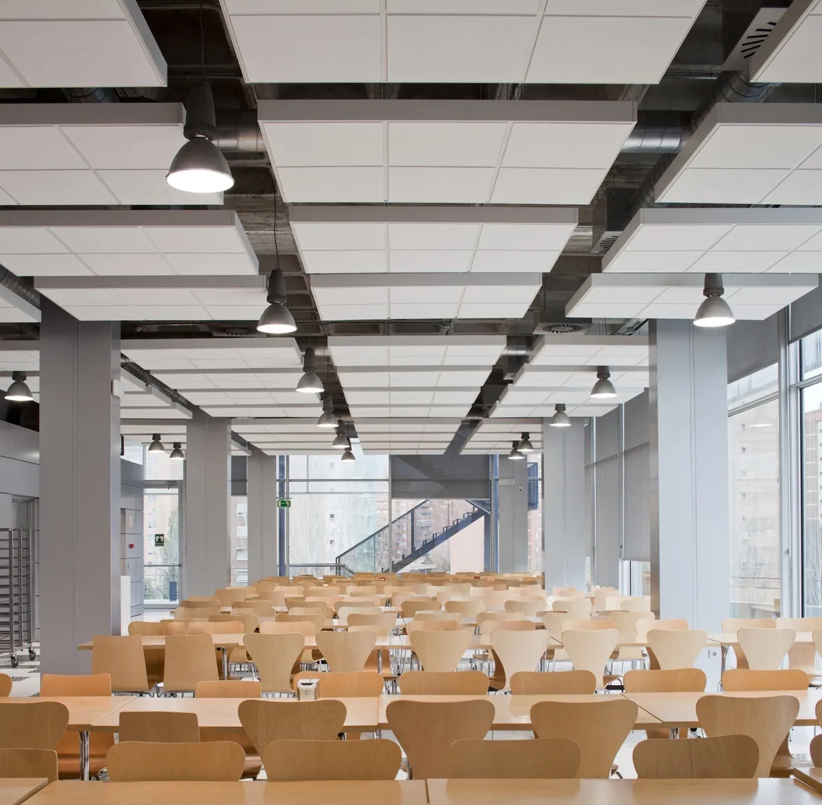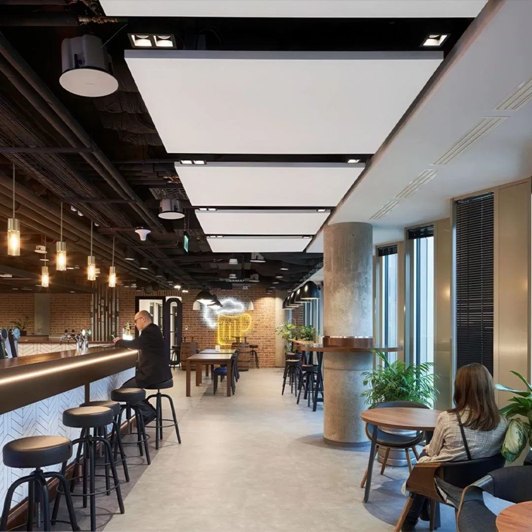 Пример — парящий потолок в кафе: панели Ecophon Solo подвешены на тросах и функционируют как островки гашения шума от посетителей. Это позволяет улучшить акустику без монтажа полной системы.