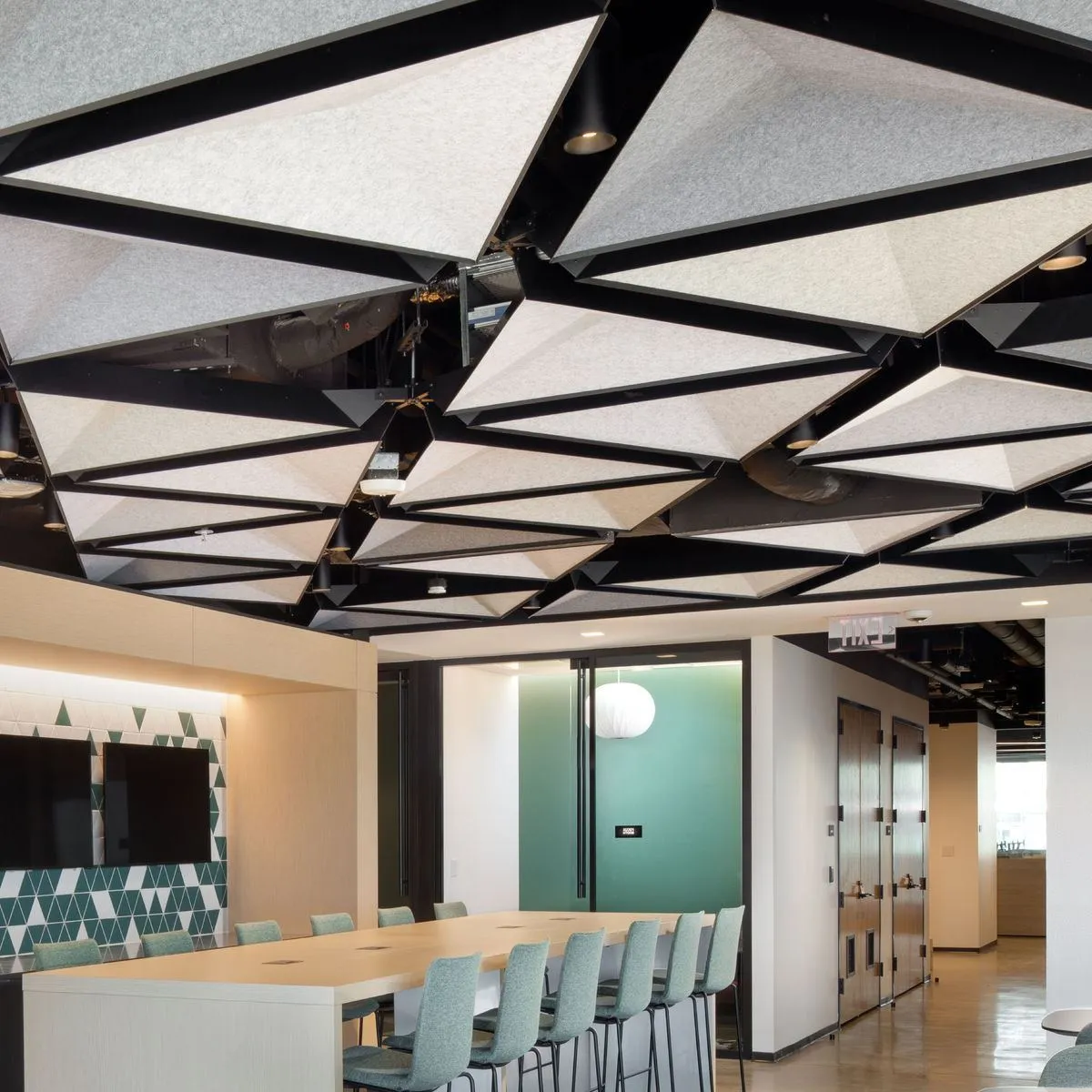 Когда важен не только звук, но и образ — на первый план выходит акустический декоративный потолок. Он сочетает дизайнерские решения (плавающие панели, разноцветные формы, индивидуальные принты) с проверенной звукопоглощающей основой. Часто такие конструкции дополняются светильниками, создают заданную геометрию пространства и становятся частью архитектурной концепции.